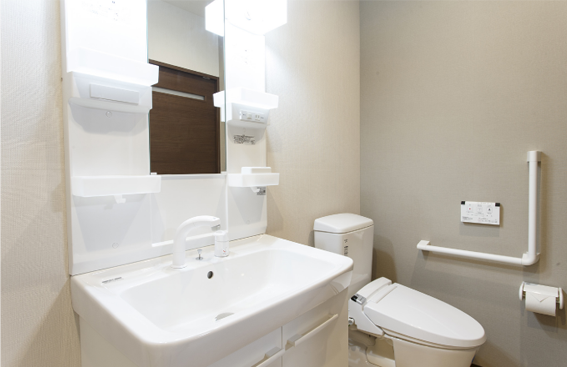 洗面化粧台は収納もたっぷり。手すりのついたウォシュレット付きトイレ。