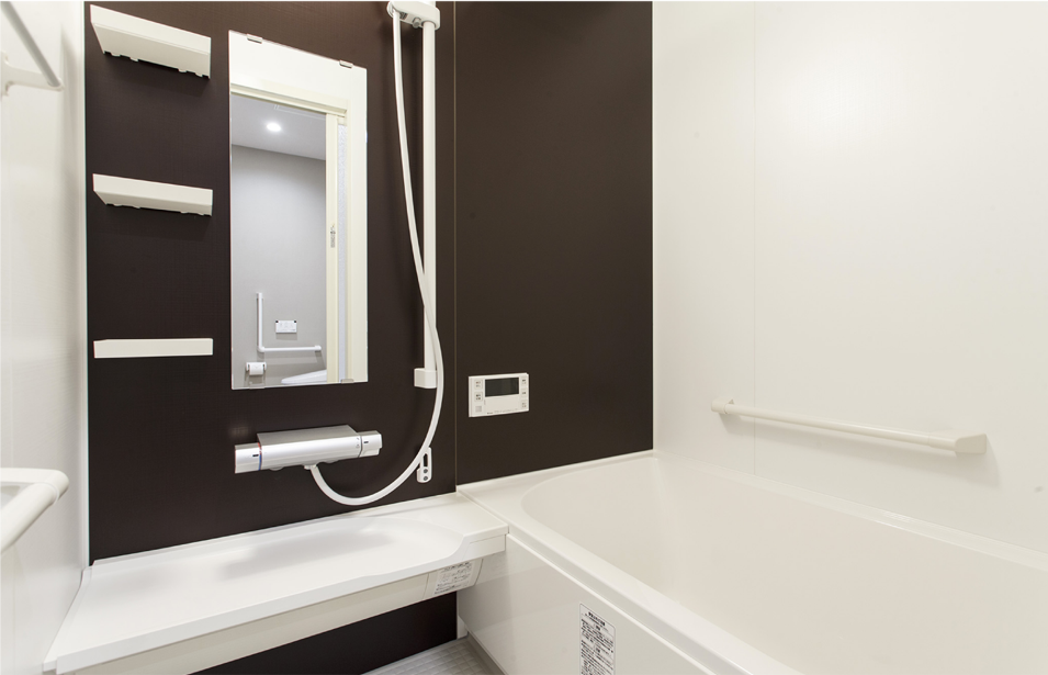 出入りしやすい浴槽、手すり付き、浴室乾燥機付きで、毎日のお風呂も快適。