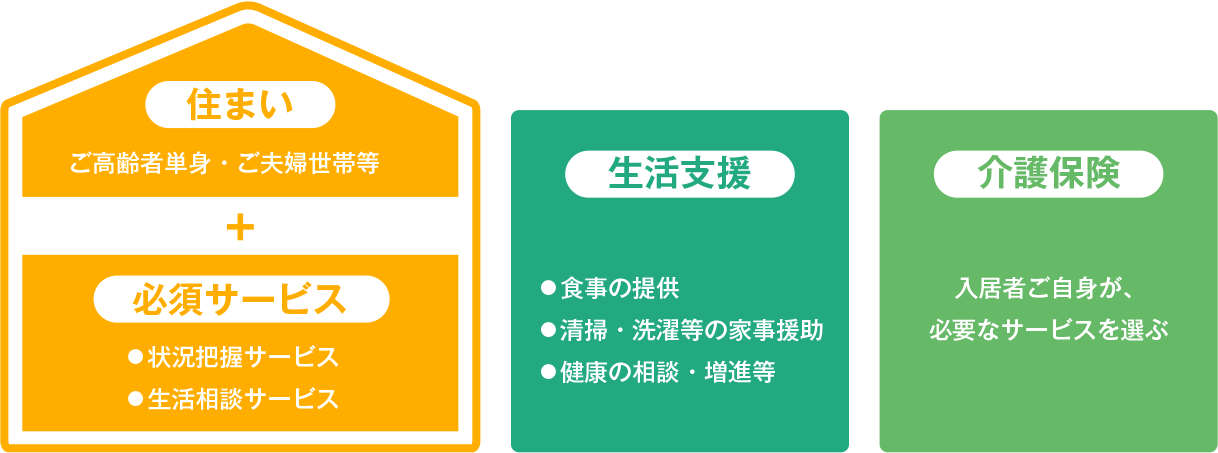 サービス付き高齢者向け住宅は、住宅部分については建物賃貸借契約を結びます。多くは敷金が必要ですが、高額な入居一時金は不要です。更新料がなく、居住の権利が保障された上で、サービスは選択制で利用します(住まいとケアの別)。